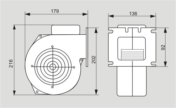 Корпус вентилятора складається з двох алюмінієвих частин, в яких встановлено електродвигун із зовнішньою крильчаткою. Вхідний отвір закритий захисною сіткою. Вихідний отвір обладнано прямокутним фланцем з отворами для монтажу на твердопаливному котлі.